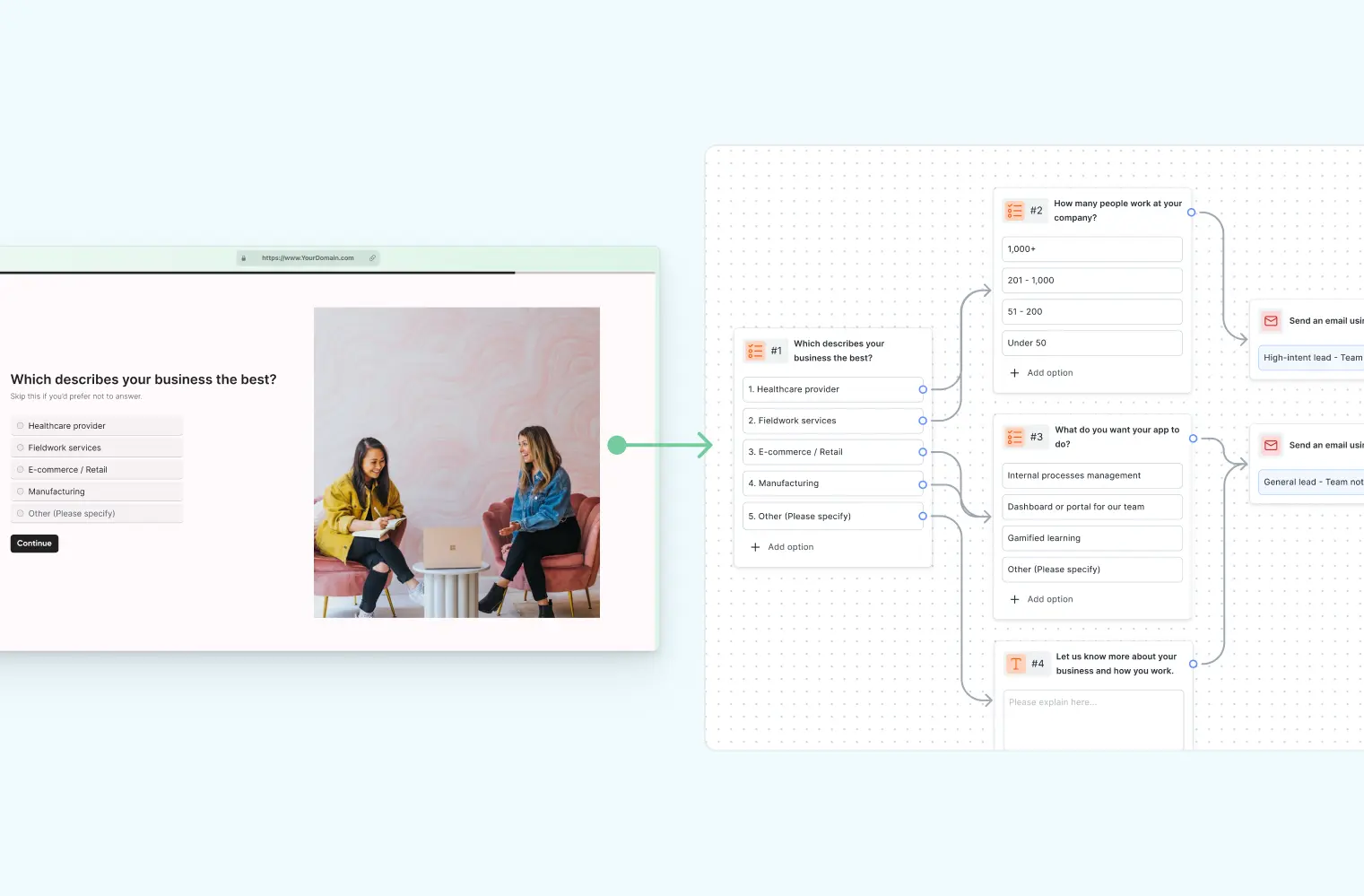 Formaloo automates workflows by integrating with CRMs, email tools, and apps like Slack. Set up triggers to send emails, assign leads, or segment responses, streamlining your business processes.